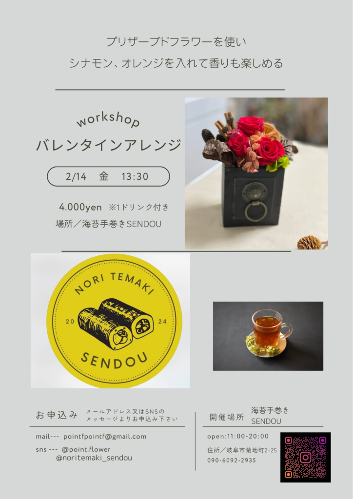 1月 22, 2025 バレンタインアレンジ 岐阜県にある カフェの雰囲気の手巻き寿司屋 noritemaki sendouさんにて バレンタインアレンジの ワークショップを開催します プリザーブドフラワーを使い オレンジ、シナモン、コーヒー豆をアクセントに 可愛らしい作品をつくります ワンドリンク付きです 先着5枚様となっております
